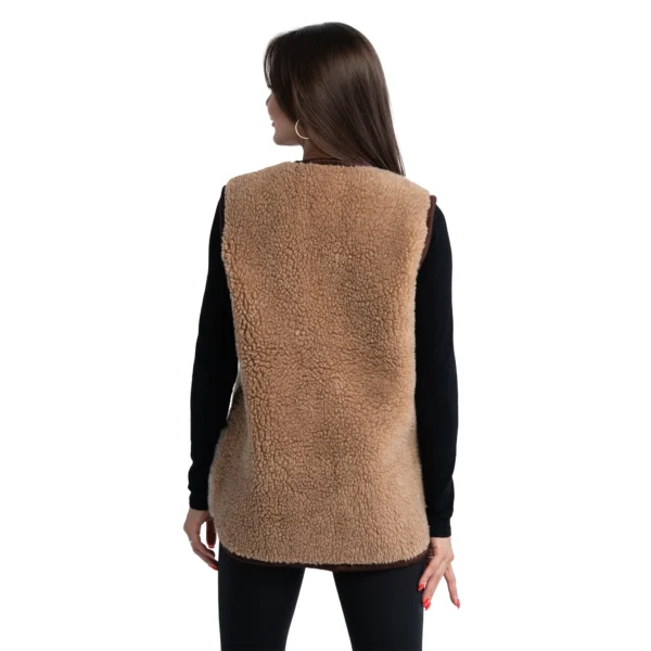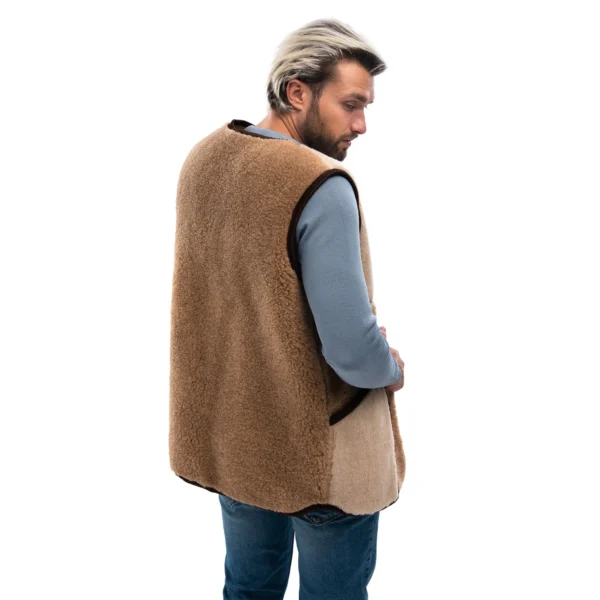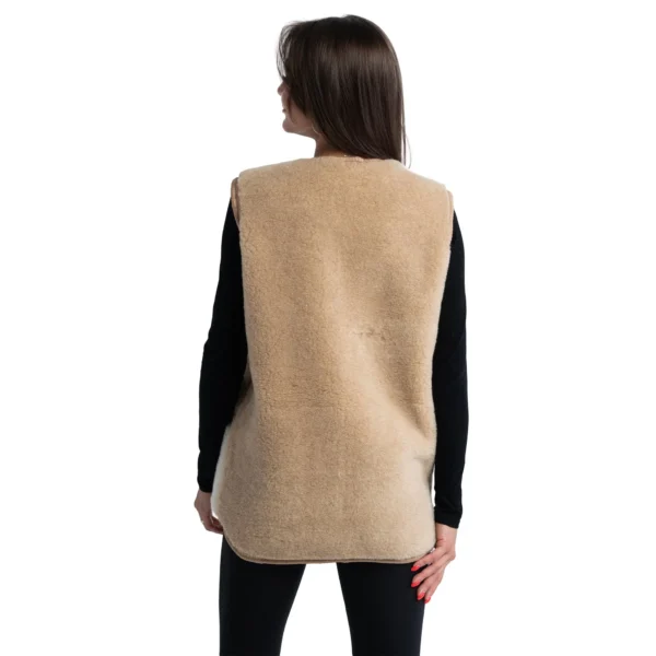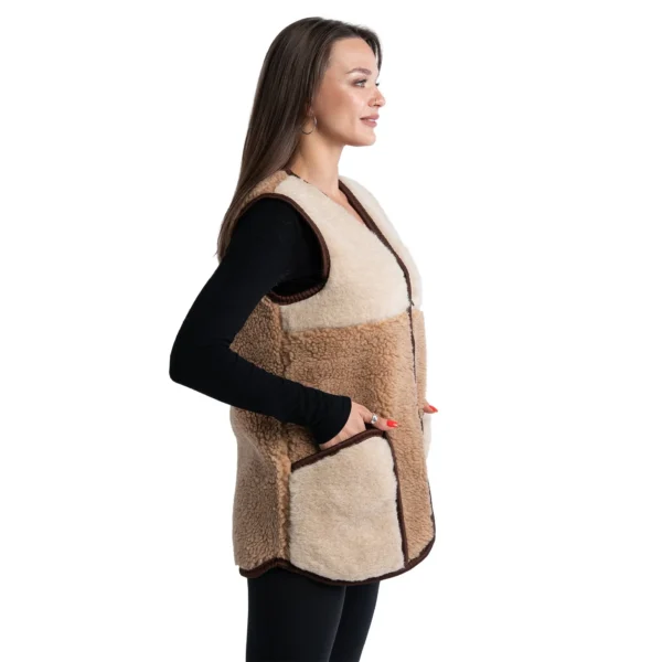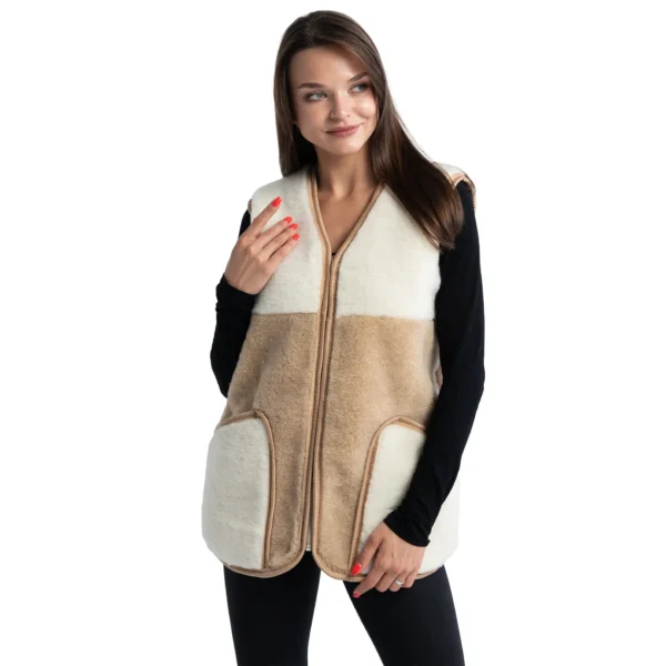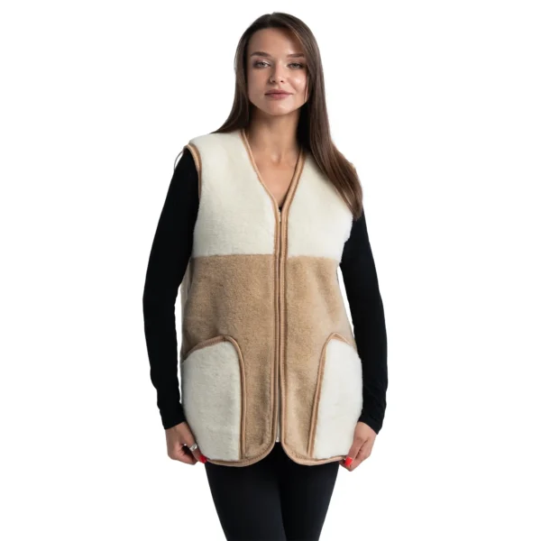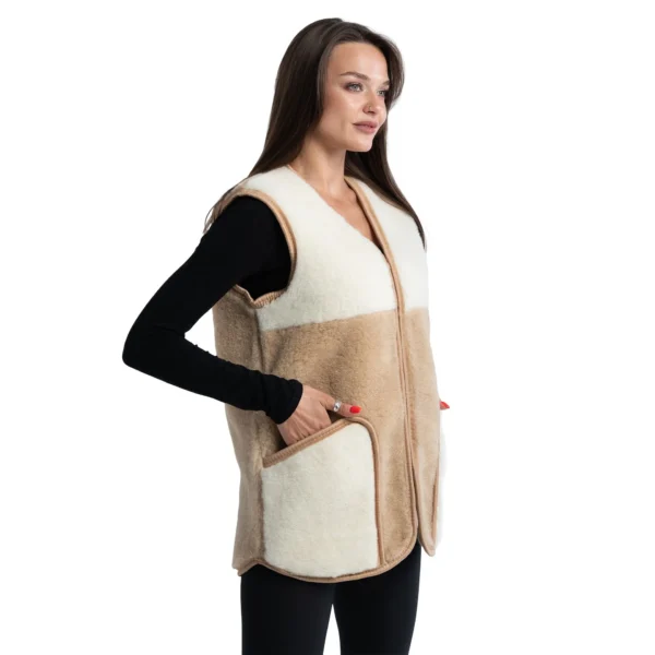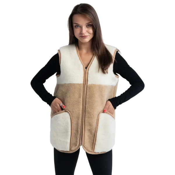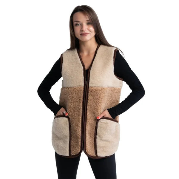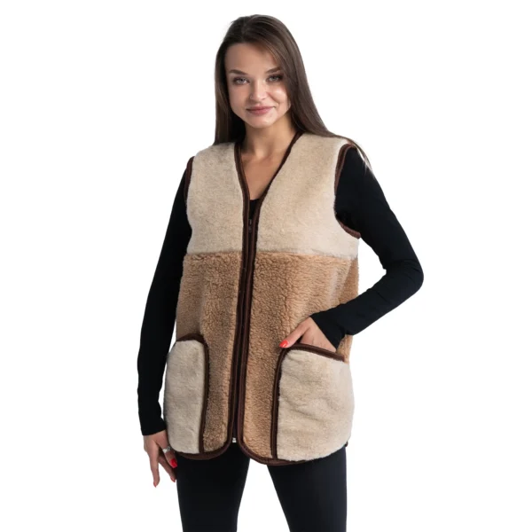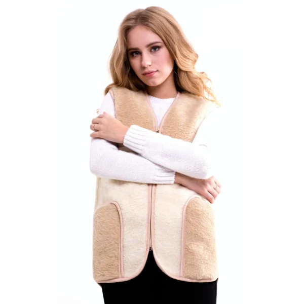 Жилет из овечьей шерсти дарит тепло и комфорт. Он прекрасно подходит для заядлых дачников и офисных работников. Ведь массаж шерстью не дает застойных эффектов в теле. Жилет можно надевать под одежду или поверх водолазки. Красота и легкость его прекрасно дополнят общий облик.
